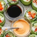 - Prepare Spicy Mayo: Mix mayonnaise and sriracha together to taste and serve alongside the cucumber sushi for dipping.
