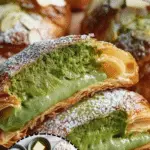 Bake the assembled croissants for 25 to 30 minutes or until they’re crisp and golden brown. The smell that fills your kitchen will be intoxicating—a warm invitation to gather around. Let them cool slightly on a wire rack before dusting powdered sugar over the surface with a fine mesh sieve. These croissants are a beautiful balance of crispy edges and tender, almond-rich interiors with the subtle, refreshing lift of matcha in every bite.
