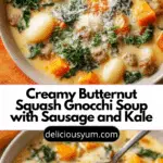 This Savory Butternut Squash Gnocchi Soup is a comforting and hearty dish perfect for cozy nights. It combines tender butternut squash, flavorful plant-based sausage, soft gnocchi, and nutrient-rich kale in a rich vegetable broth enhanced with garlic, herbs, and sun-dried tomatoes. Finished with creamy half-and-half and a sprinkle of Parmesan cheese, this soup offers layers of savory depth and texture, making it a satisfying meal for vegetarians and soup lovers alike.