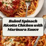 This Spinach Ricotta Chicken recipe features tender chicken breasts topped with a creamy, cheesy spinach and ricotta mixture, baked to perfection with marinara sauce and melted parmesan. It’s a comforting, flavorful dish perfect for a hearty weeknight dinner.
